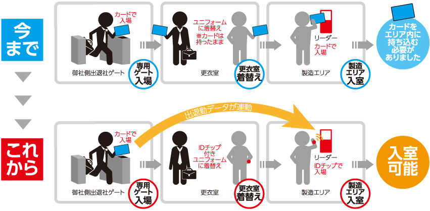 レンタルユニフォーム一枚一枚に組み込まれたIC チップを工場内の入退室に活用したのが「入退室管理システム」です。ユニフォームをID カード代わりにすることで異物混入のリスクを軽減し、セキュリティを向上させます。オプション機能として勤怠管理、工数管理も可能です。食品工場で多く活用頂いています。